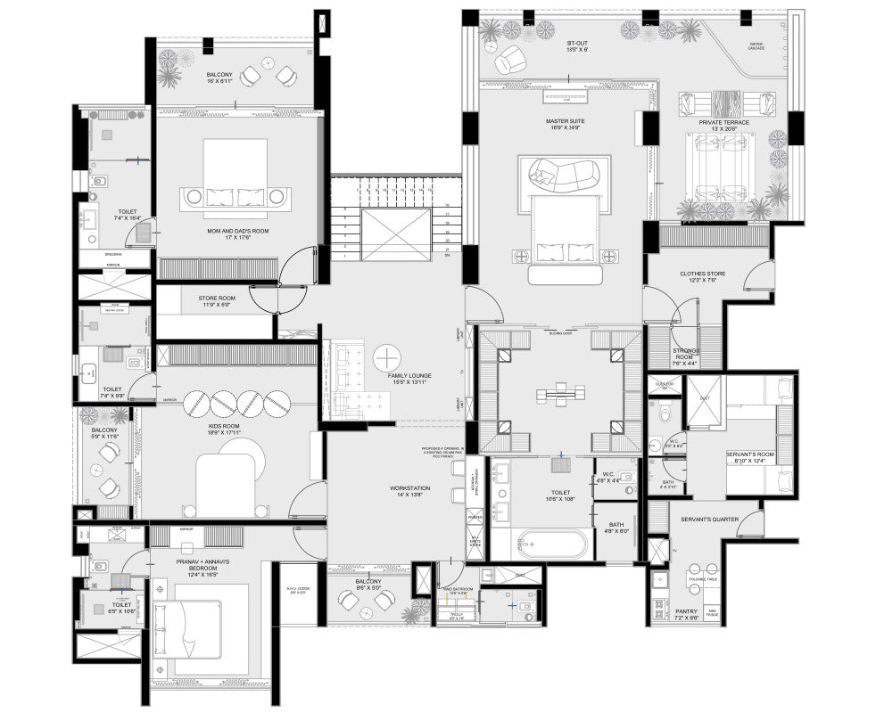 The project is a luxurious 6 bedroom duplex planned by combining two 4- bed apartments and introducing an internal stairway. The layout of the house was worked out keeping in mind the specific needs of the family. Each space is designed to be a fingerprint of the user, very personal yet simple.