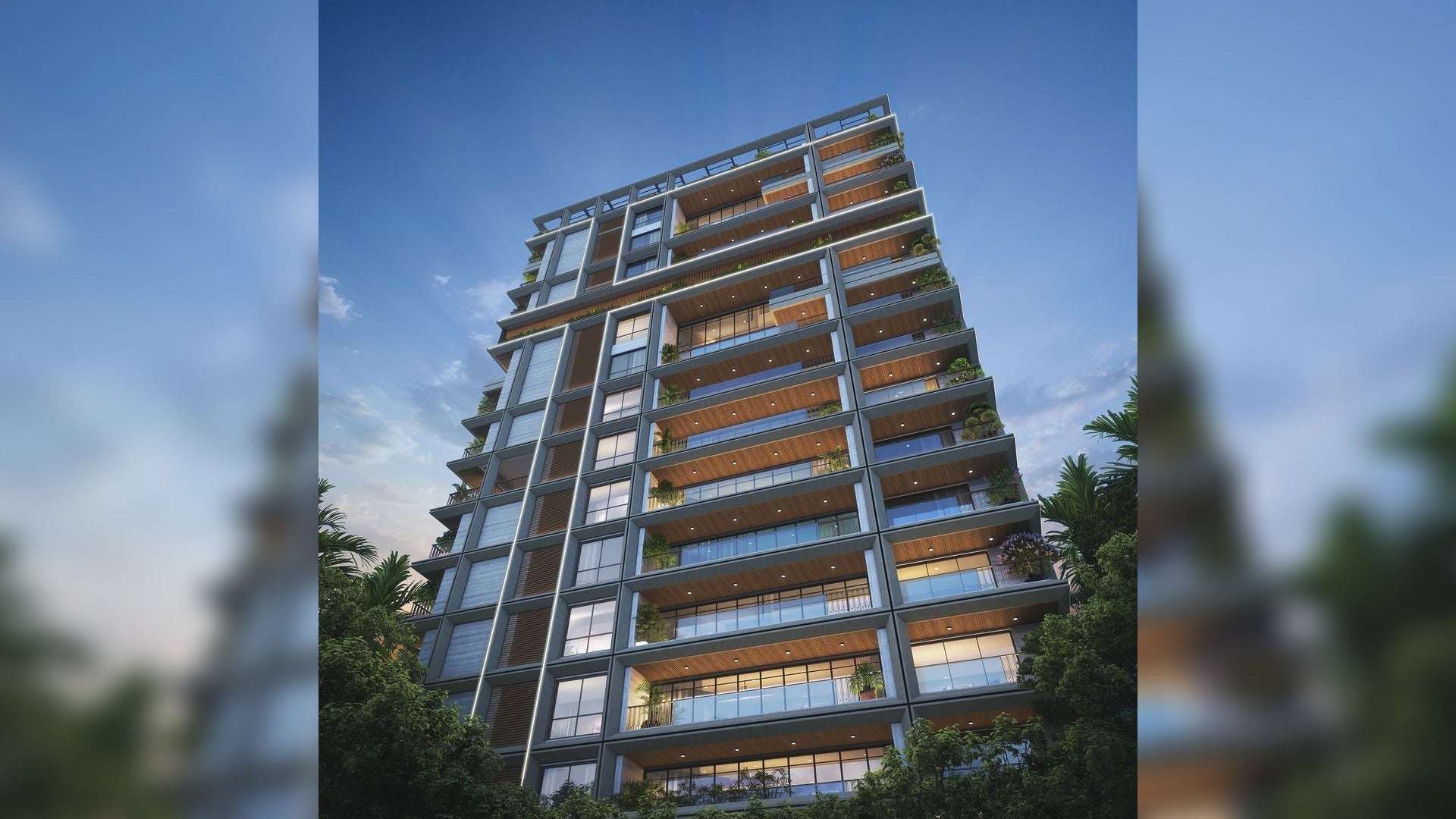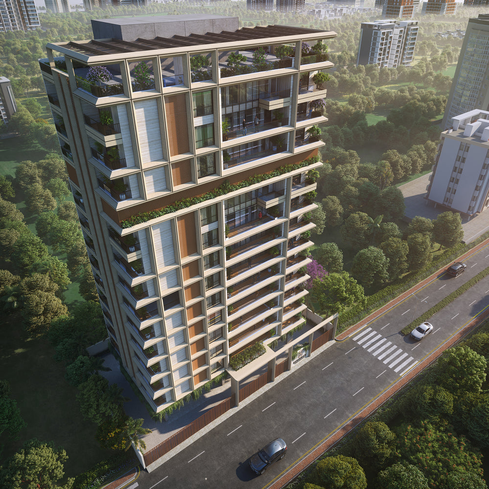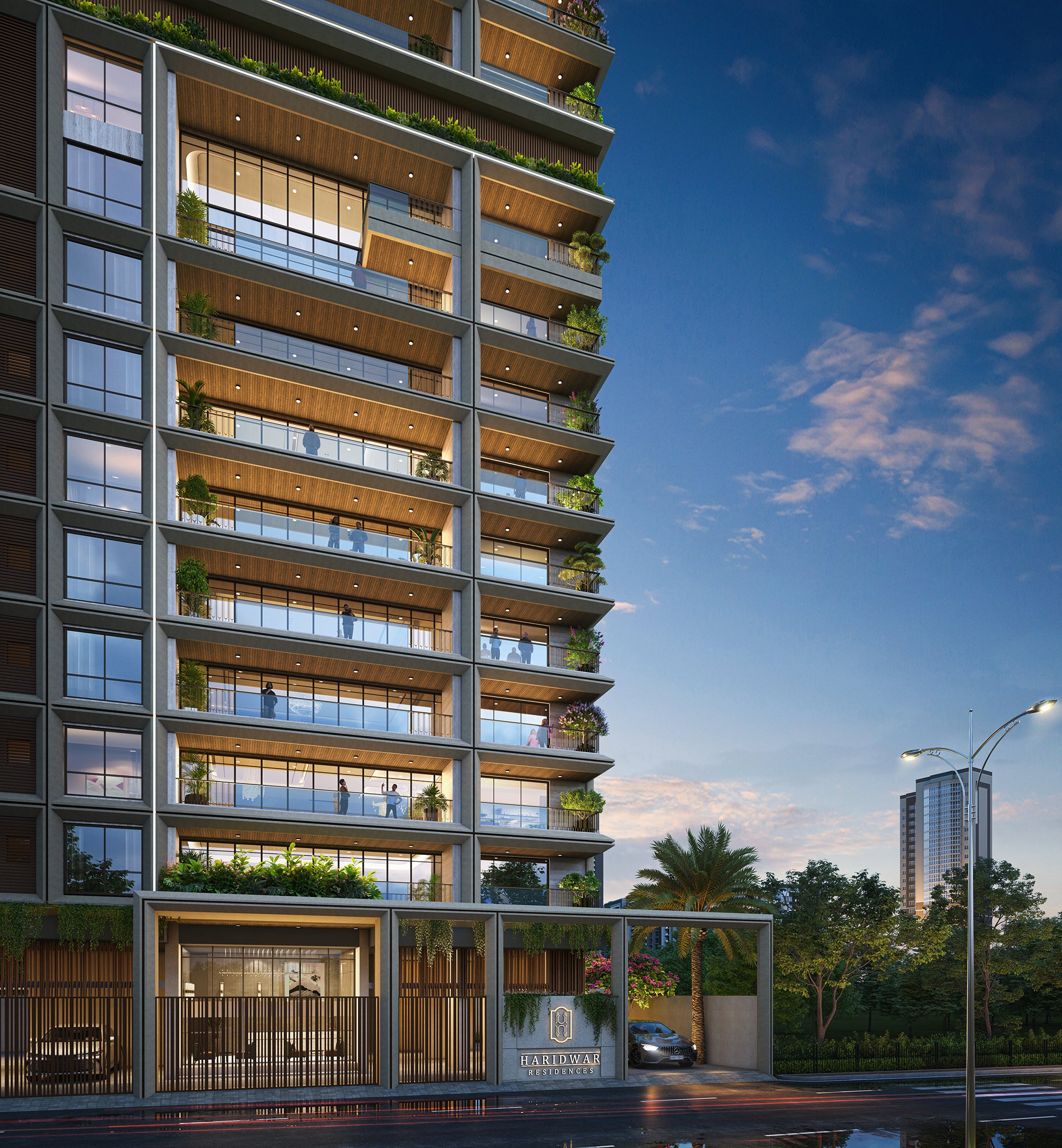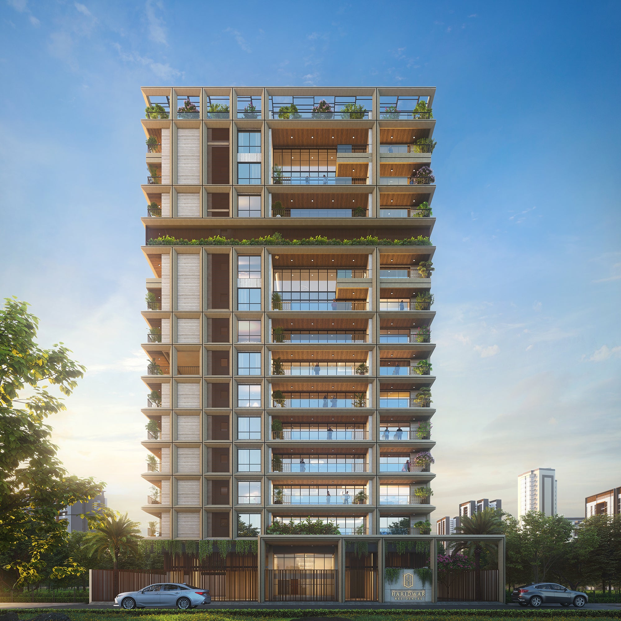 Haridwar Residences represents contemporary high-rise living that balances urban density with human-scaled design elements. The architectural approach emphasizes vertical landscaping, natural materials, and varied facade treatments to create a landmark residential building that enhances the Prabhat Road streetscape.